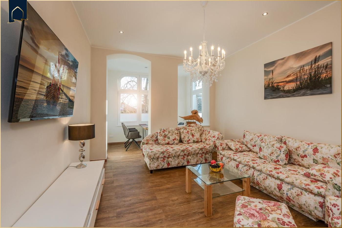 Apartment mit 1 Schlafzimmer. This spacious apartment is comprised of 1 living room, 1 separate bedroom and 1 bathroom with a shower and a hairdryer. In the kitchen, guests will find a stovetop, a refrigerator, a dishwasher and kitchenware. The apartment offers a TV, a coffee machine, a seating area, a wardrobe as well as garden views. The unit offers 2 beds.