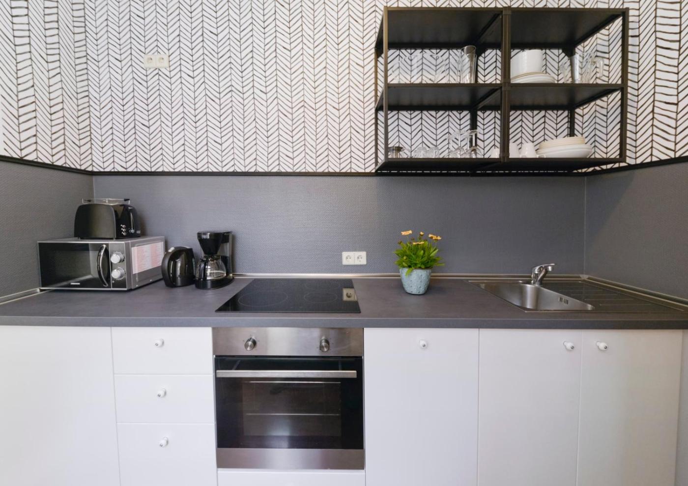Studio Plus, Schönhauser Allee Nr. 5, Berlin - Mitte. Mit Blick auf den Innenhof. Dieses Apartment verfügt über ein Zimmer mit 2 Einzelbetten und einem Doppelschlafsofa, eine voll ausgestattete Küche und kostenfreies WLAN. Ein Aufzug ist nicht vorhanden. Adresse: Schönhauser Allee 5, 10119 Berlin. Bitte beachten Sie, dass diese Apartmentart mit drei unterschiedlichen Grundrissen verfügbar ist. Die Fotos zeigen Beispiele für jeden Grundriss. ;