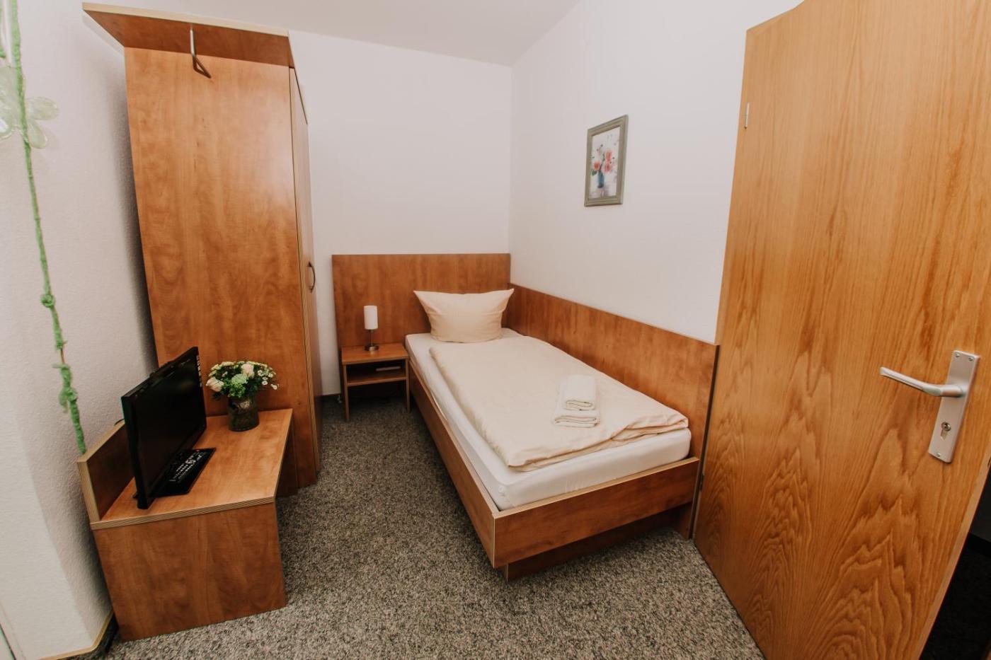 Einzelzimmer. Dieses helle Zimmer verfügt über einen Flachbild-TV und ein eigenes Bad mit einem Haartrockner. ;
