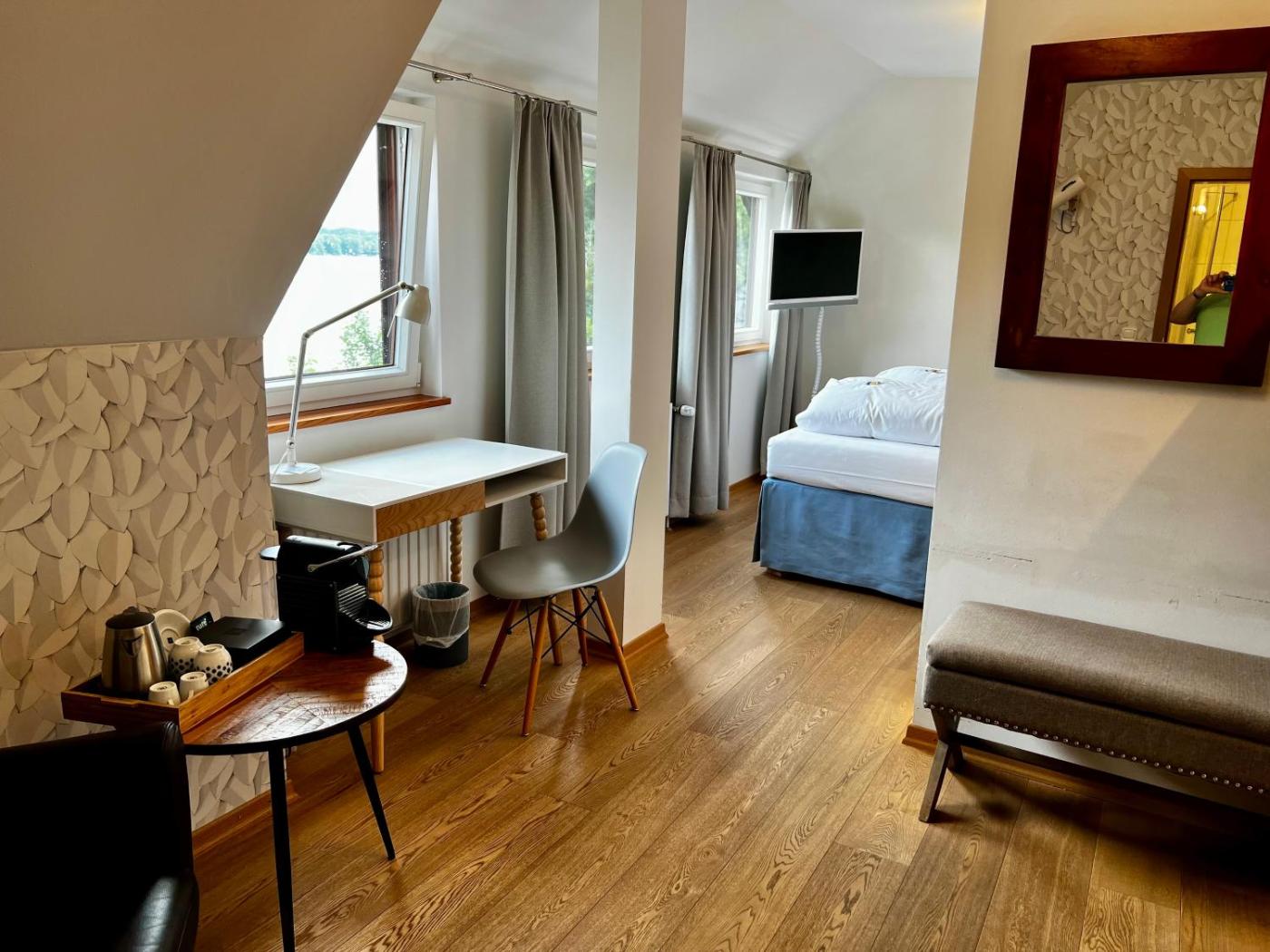Doppelzimmer mit Seeblick. Offering free toiletries, this double room includes a private bathroom with a shower and a hairdryer. The spacious double room offers a flat-screen TV with satellite channels, a tea and coffee maker, a seating area, a sofa as well as lake views. The unit offers 1 bed. ;