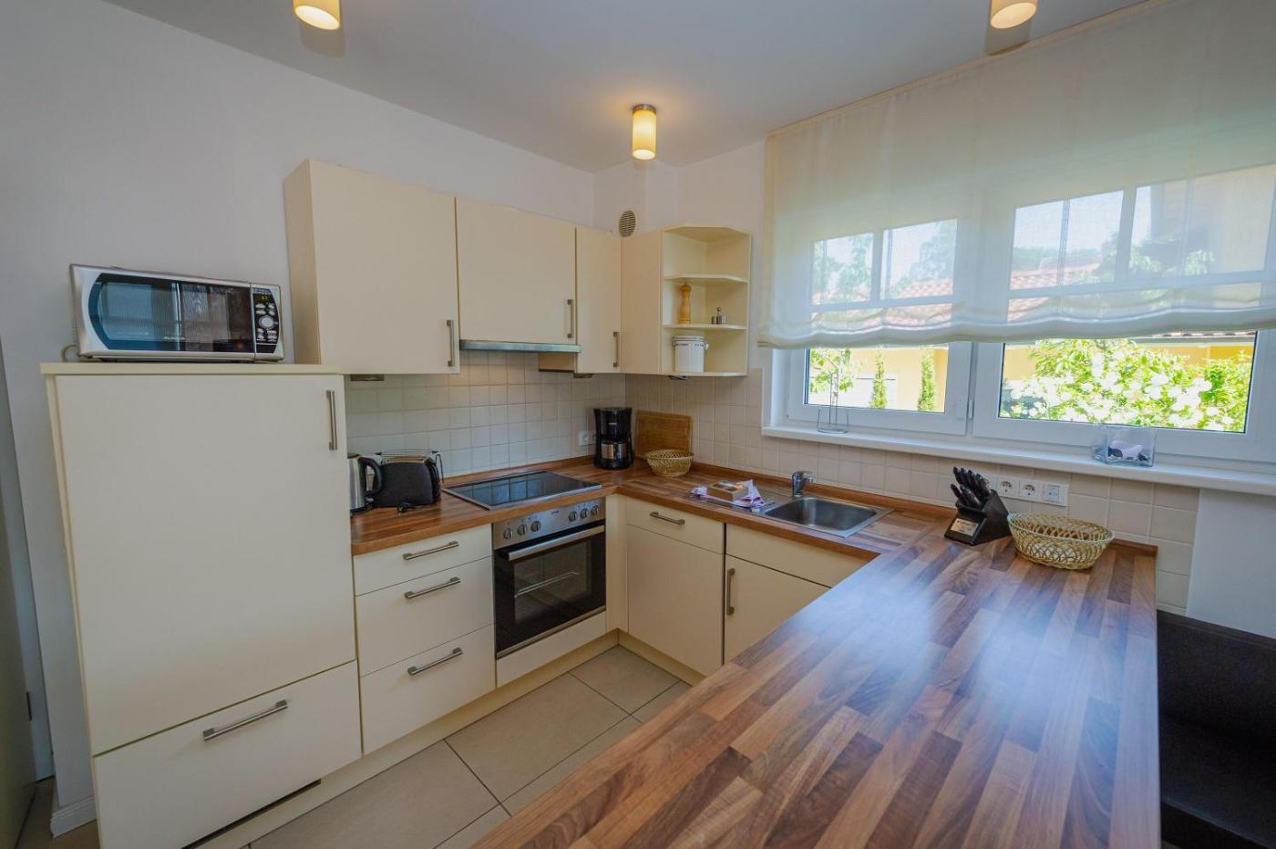 Apartment mit Sauna. The sauna and fireplace are the special features of this apartment. This spacious apartment comes with 1 living room, 3 separate bedrooms and 1 bathroom with a walk-in shower and a hairdryer. Guests can make meals in the kitchen that features a stovetop, a refrigerator, a dishwasher and an oven. Boasting a terrace with garden views, this apartment also features a washing machine and a flat-screen TV with cable channels. The unit has 4 beds.