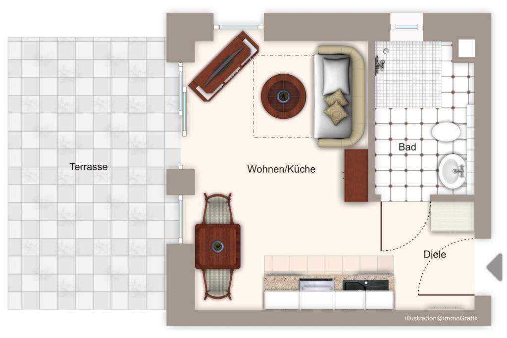 Apartment mit Terrasse. The apartment offers a coffee machine, a seating area, as well as a private bathroom boasting a shower and a hairdryer. The well-equipped kitchen has a stovetop, a refrigerator, a dishwasher and kitchenware. Featuring a terrace, this apartment also features a wardrobe, heating and a TV. The unit has 1 bed.